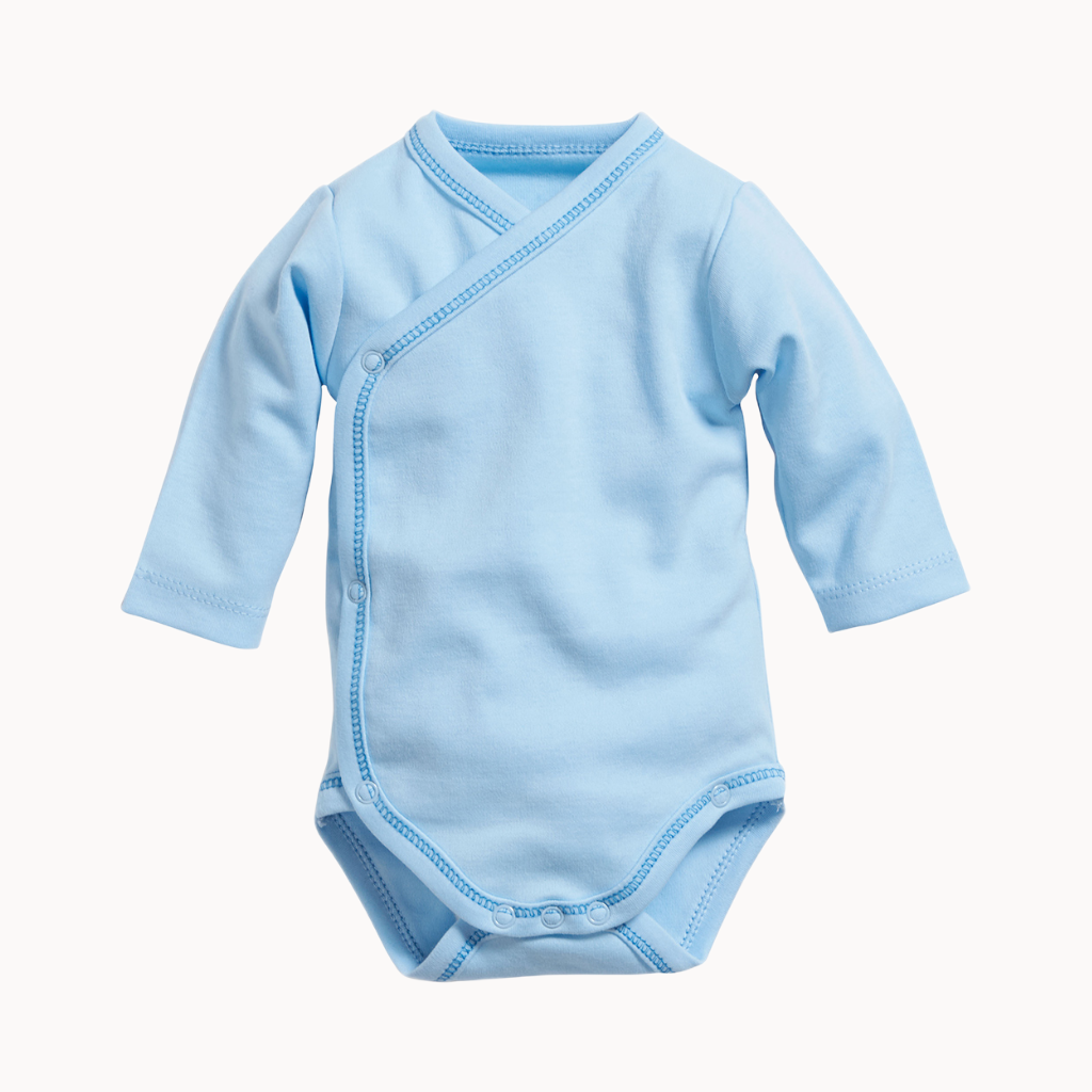 Sehr bequemer und praktischer Wickelbody mit Langarm in dem sich die Babys besonders wohlfühlen. Einfach zum An- und Ausziehen durch praktische Druckknöpfe.